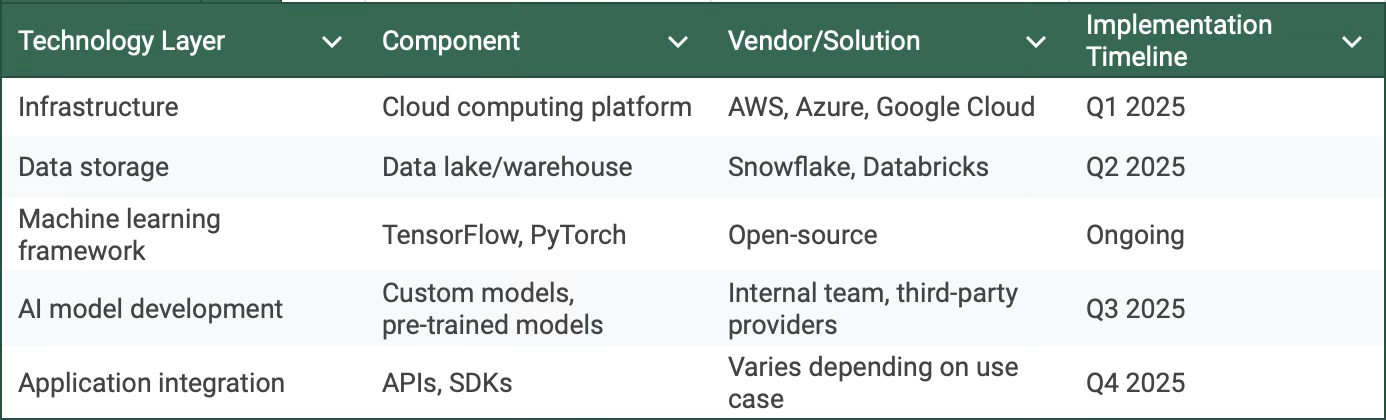 Skills Inventory: Assess the current skillset of the IT team and identify areas where additional expertise in AI,machine learning, and data science is needed.