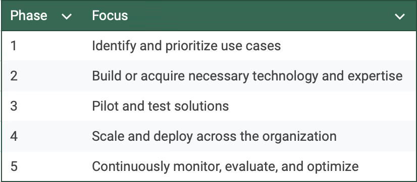 This roadmap provides a structured approach to implementing Gen AI, ensuring that initiatives are aligned with strategic goals and deliver tangible results.