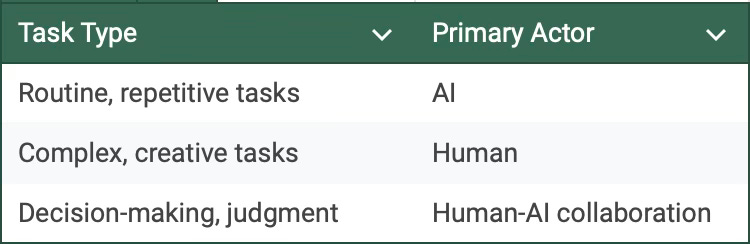 This model outlines the optimal division of labor between humans and AI, leveraging the strengths of each to achieve optimal outcomes.