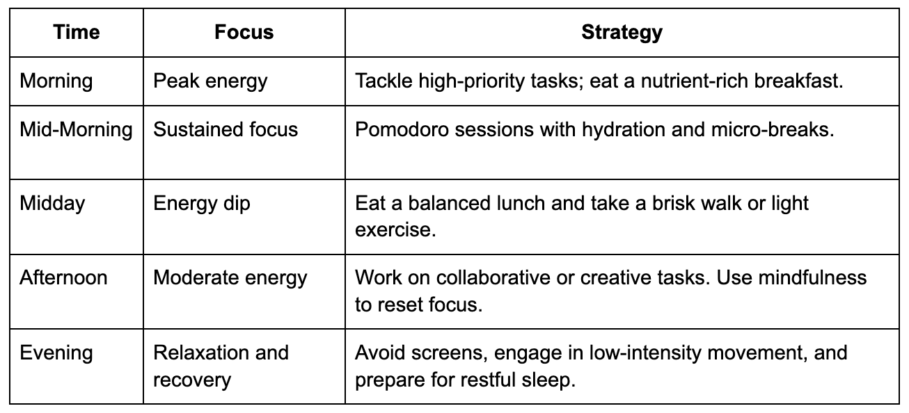 To integrate these strategies seamlessly into your day, align activities with your energy peaks and valleys: