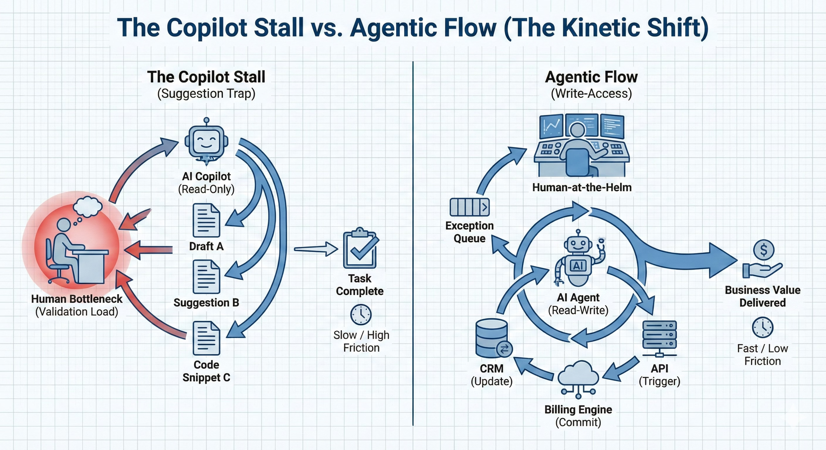 From a systems engineering perspective, the Copilot model introduced a dangerous variable: cognitive friction. By placing the AI in a “suggest-only” mode, we forced the human operator to act as the ultimate validation layer for every single micro-task. The human remained the bottleneck. The AI generated potential energy (drafts, suggestions, code snippets), but it required human kinetic energy to convert that potential into work.