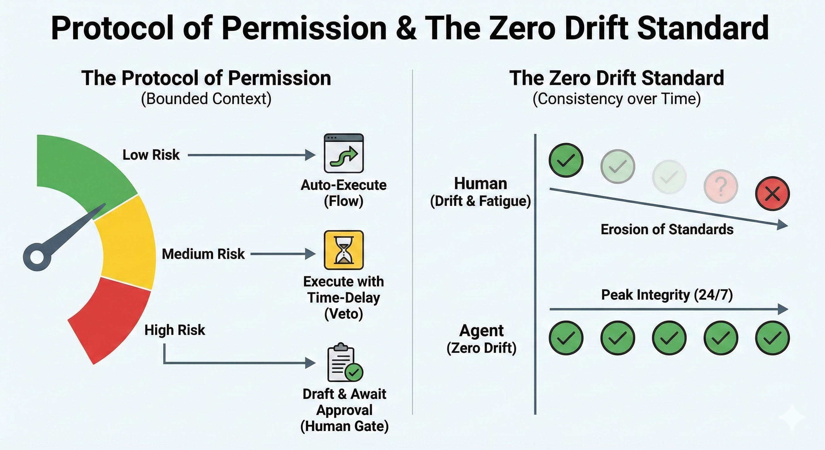 By codifying these rules, we create a “Physics of Permission.” The agent flows like water through the path of least resistance (low risk), only stopping when it hits a dam (high risk).
